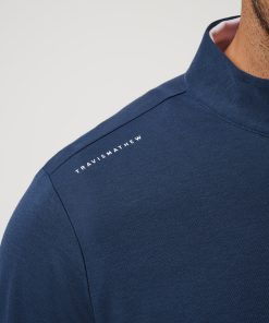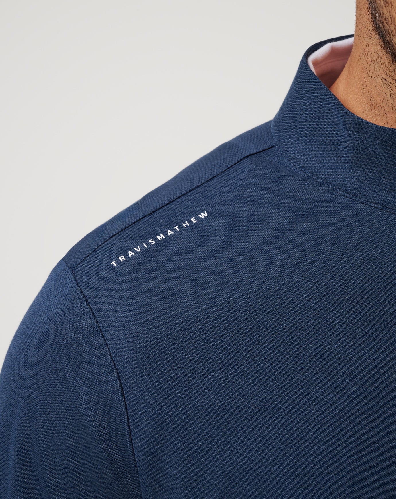 - TravisMathew logo printed on shoulder seam.