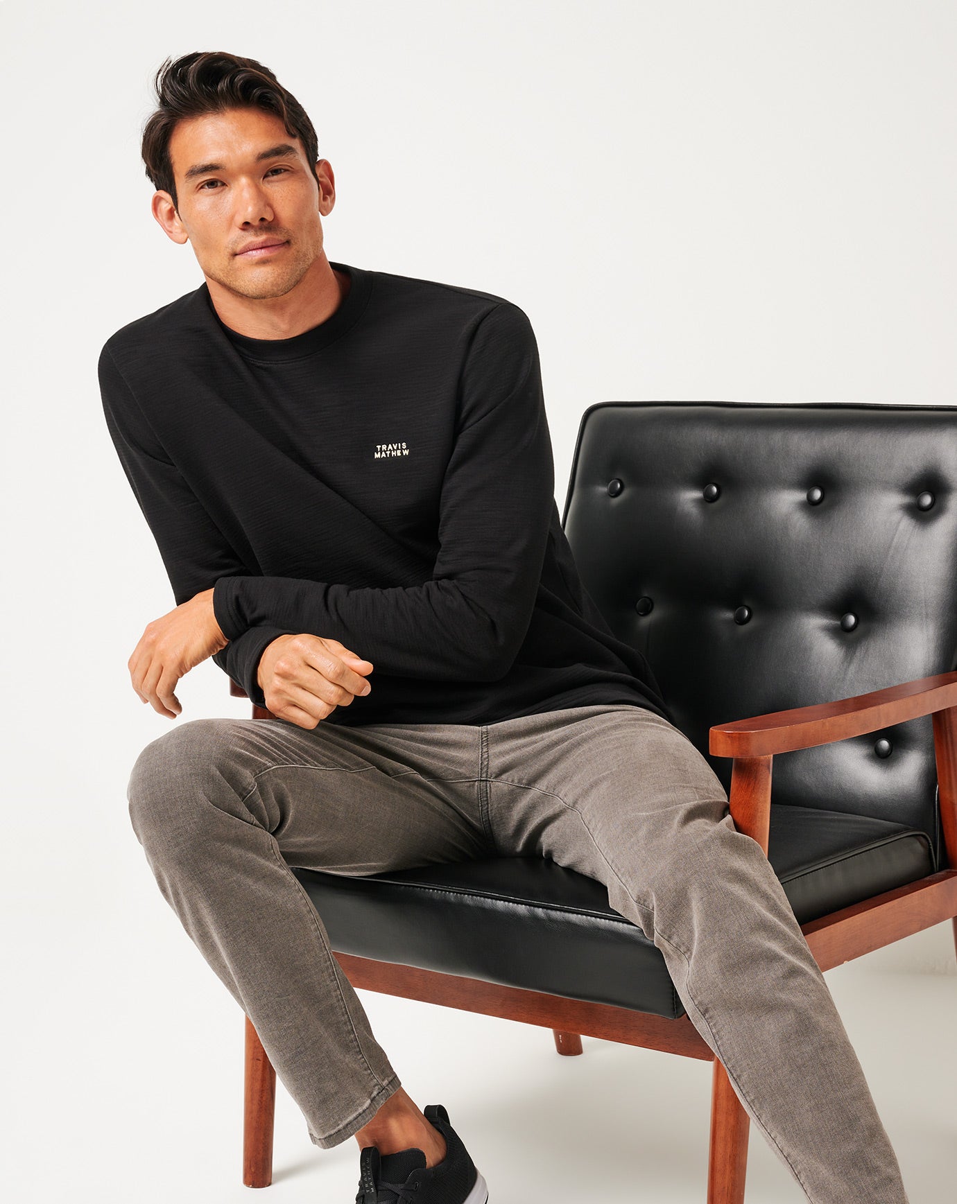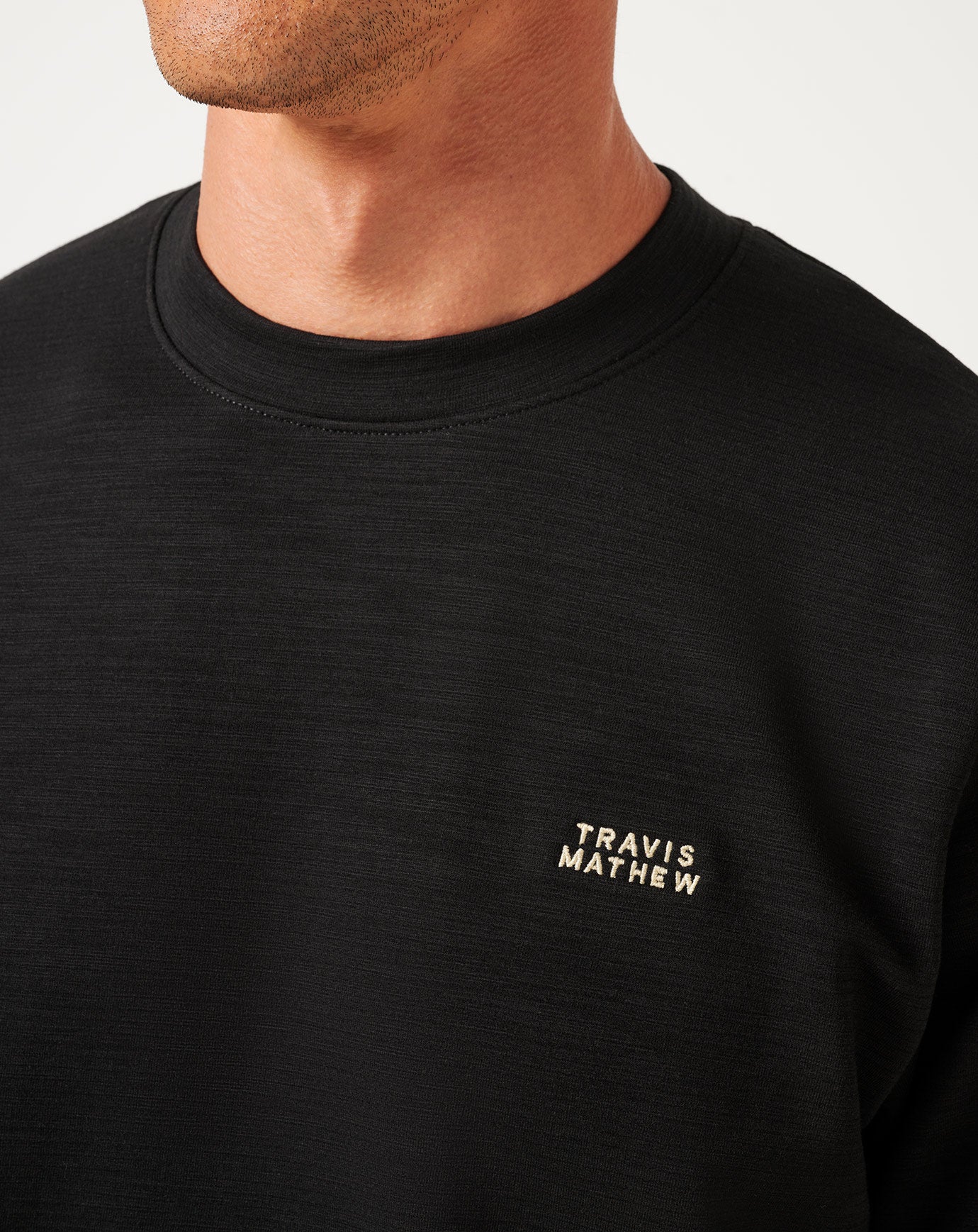 Casual, comfortable, and just a little refined—the MAN ABOUT TOWN, a soft, crewneck pullover sweater, brings effortless style with a clean crew neck, embroidered TravisMathew block logo, and an Italian sand twill tape detail for that extra touch.