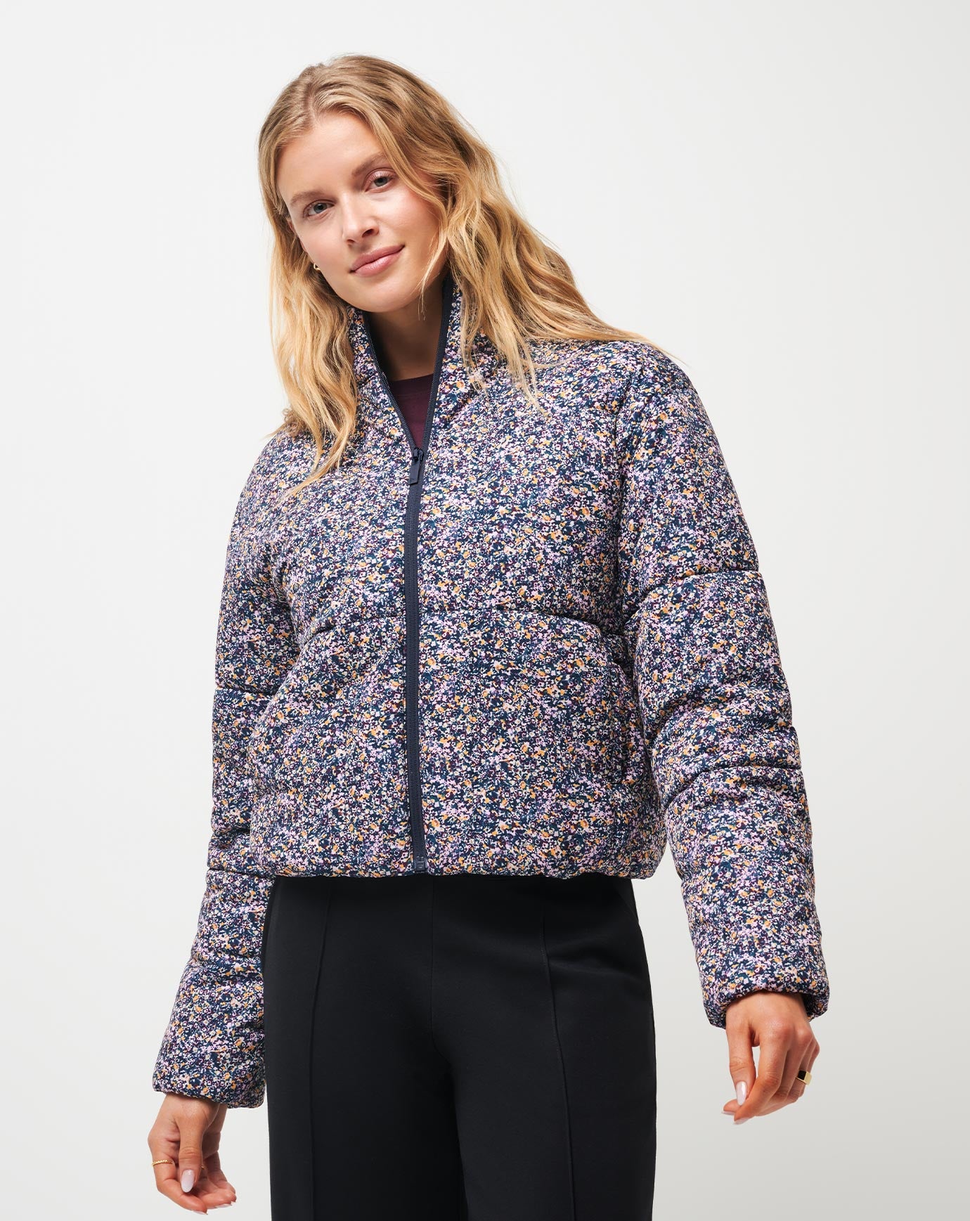 Your favorite jacket now comes in a new floral print! From early morning commutes to chilly nights out on the town, your last layer should be your best layer. With the MONT BLANC FLORAL jacket, keep warm with an insulated design featuring oversized quilting, while a satin interior liner and satin trim deliver a truly modern style.